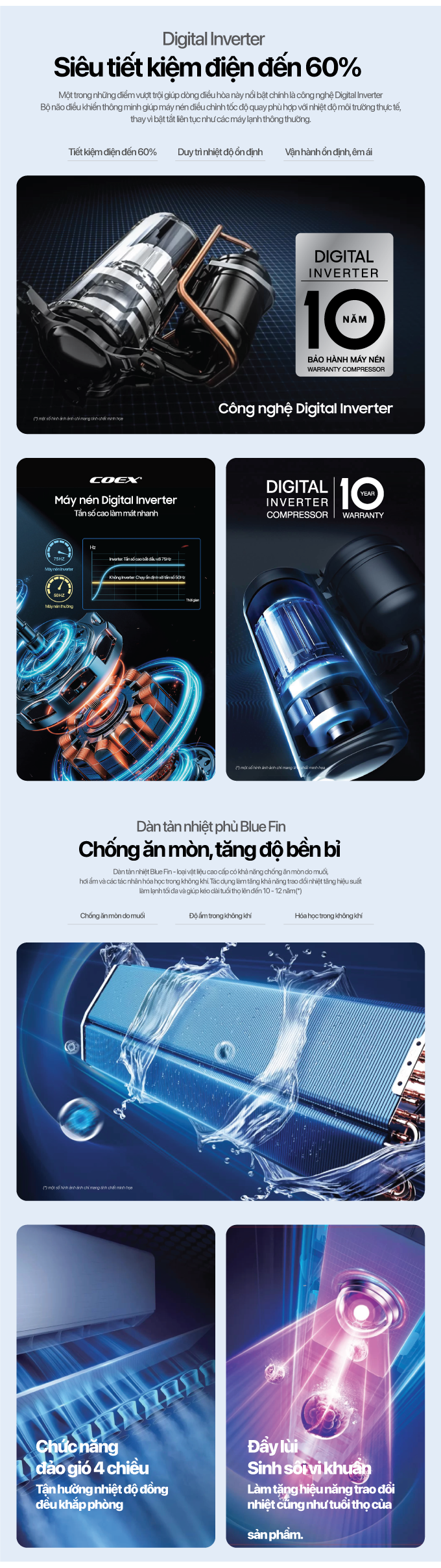 Trong bối cảnh thời tiết thất thường, một chiếc điều hòa chỉ làm lạnh là chưa đủ. Điều hòa Coex 2 chiều Inverter 12000BTU/1HP COEX CA-12IN38HP mang đến giải pháp toàn diện: làm mát nhanh mùa hè, sưởi ấm hiệu quả mùa đông, vận hành êm ái và tiết kiệm điện năng đáng kể. Đây là lựa chọn thực tế cho gia đình hiện đại, đặc biệt phù hợp với phòng ngủ, phòng làm việc hoặc phòng khách diện tích từ 15m² – 20m².